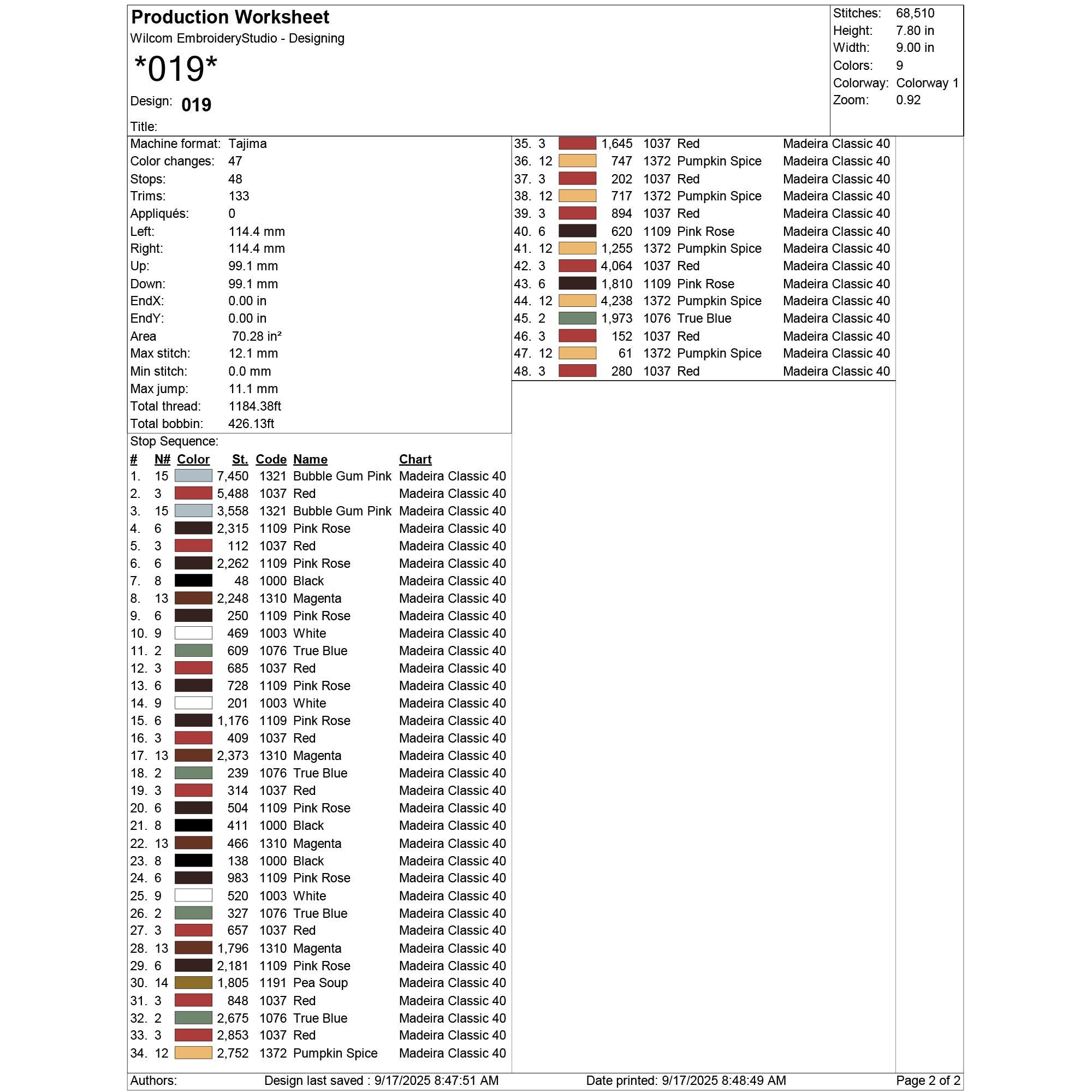 File Code – 019: 68,510 stitches — 7.80" (H) x 9.00" (W) — 9 colors