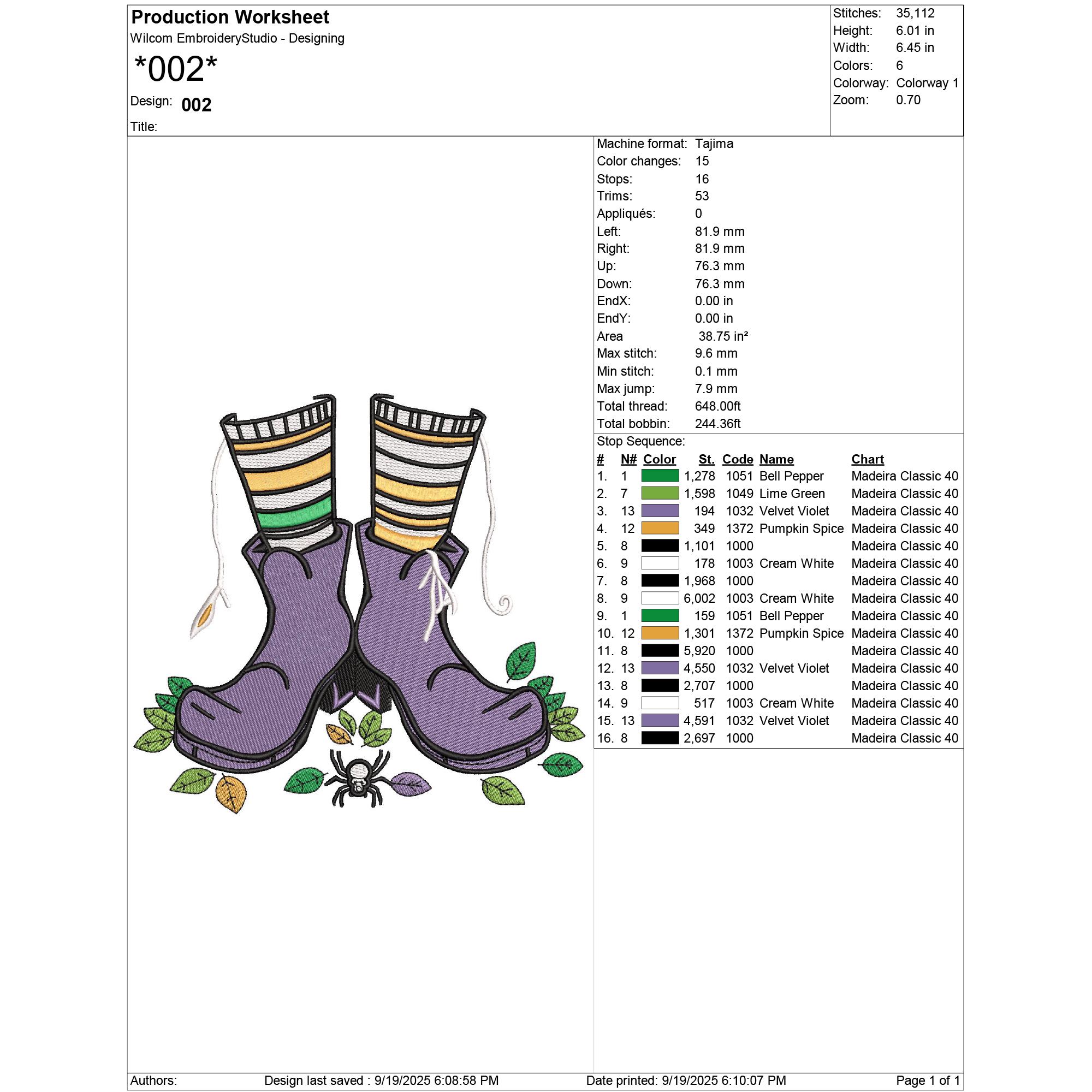 002 – 35,112 stitches | Size: 6.01 in x 6.45 in (15.3 cm x 16.4 cm / 153 mm x 164 mm) | 6 colors