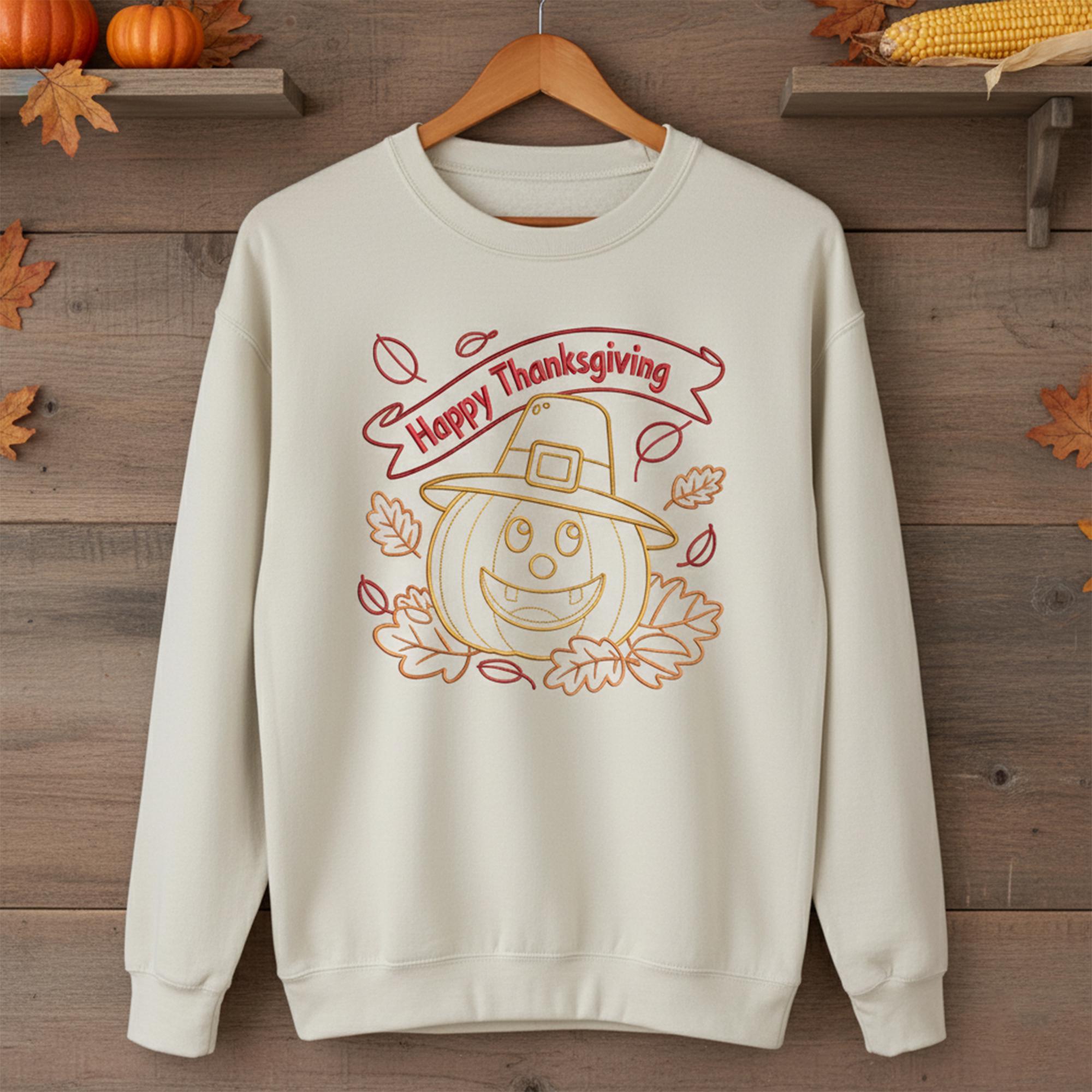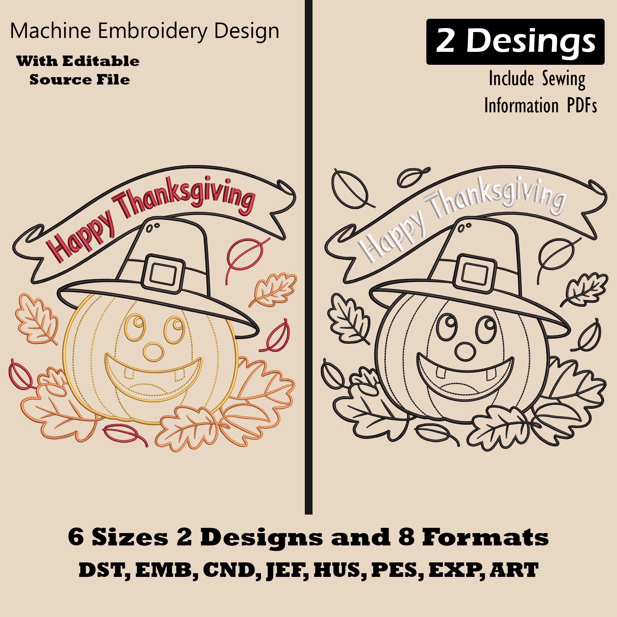 Celebrate the season of gratitude with this Happy Thanksgiving Pumpkin Embroidery Design, perfect for adding a warm autumn touch to clothing, table linens, home décor, and festive gifts. Featuring both simple and detailed versions, this design is ideal for Thanksgiving projects and fall embroidery creations.