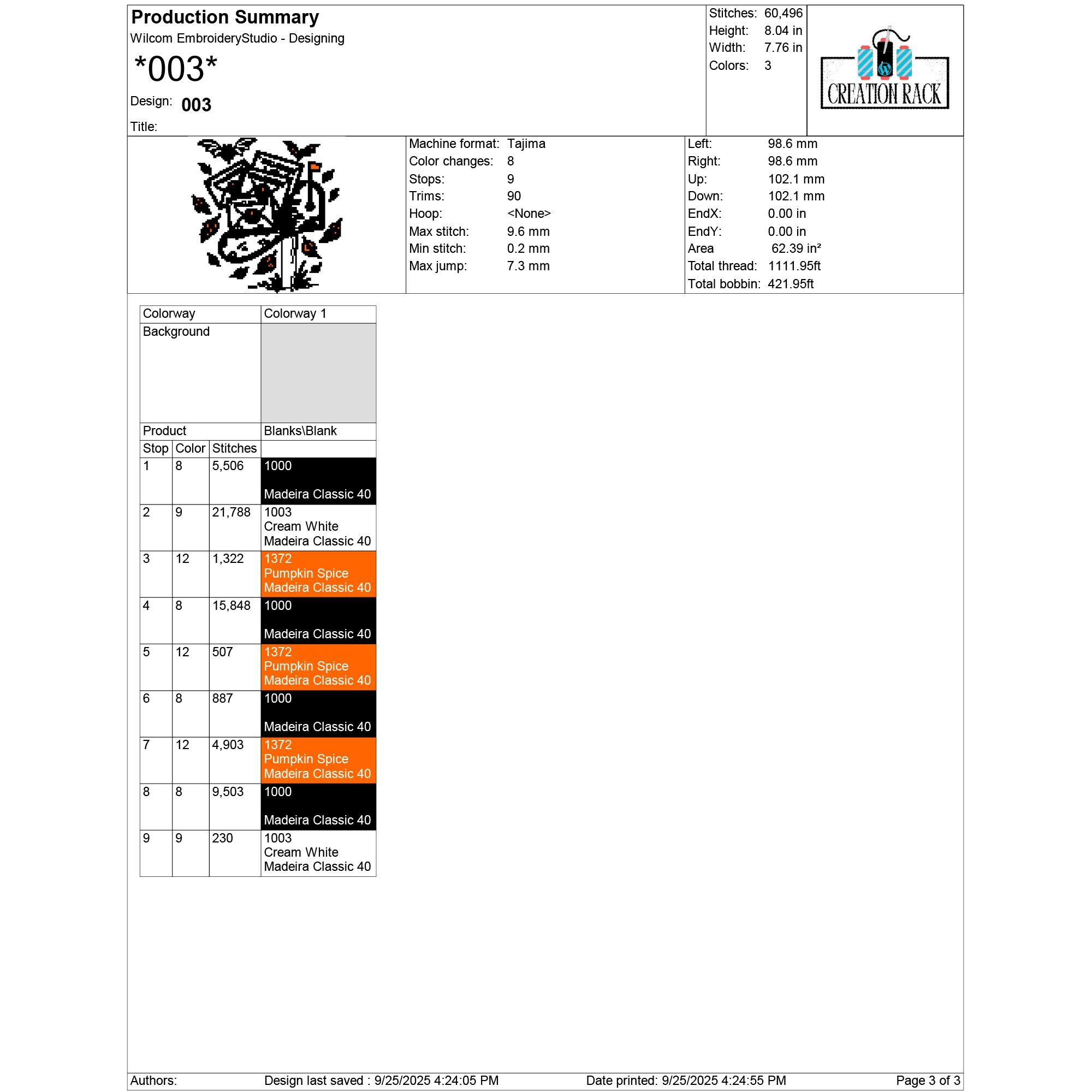 003 – 60,496 stitches | Size: 8.04 in x 7.76 in (20.4 cm x 19.7 cm / 204 mm x 197 mm) | 3 colors