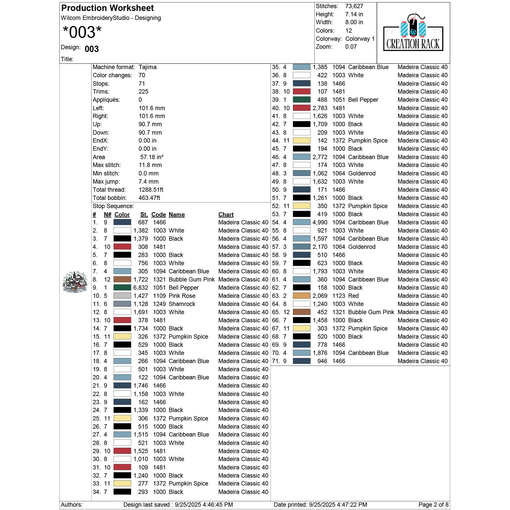 003 – 73,627 stitches | Size: 7.14 in x 8.00 in (18.1 cm x 20.3 cm / 181 mm x 203 mm) | 12 colors