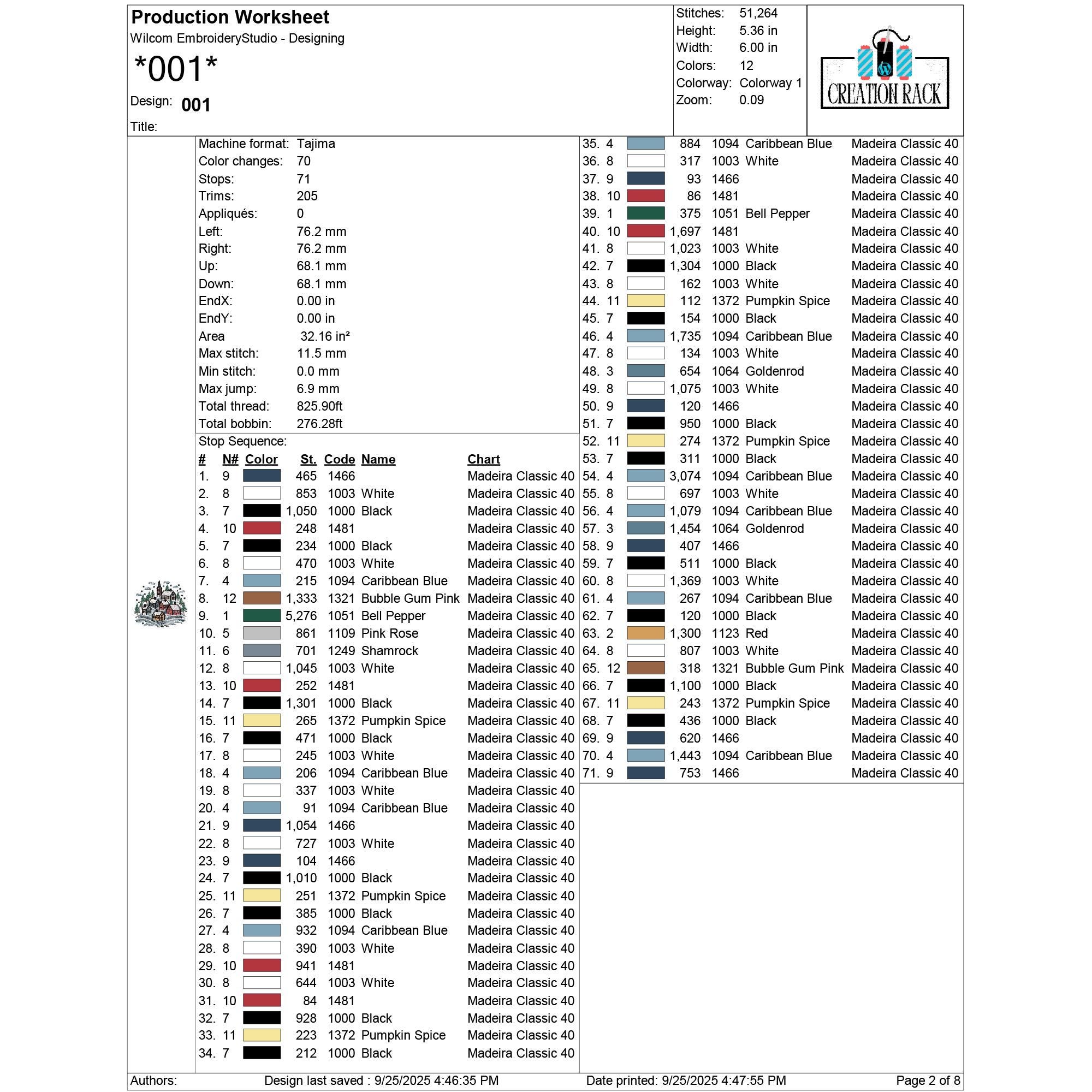 001 – 51,264 stitches | Size: 5.36 in x 6.00 in (13.6 cm x 15.2 cm / 136 mm x 152 mm) | 12 colors