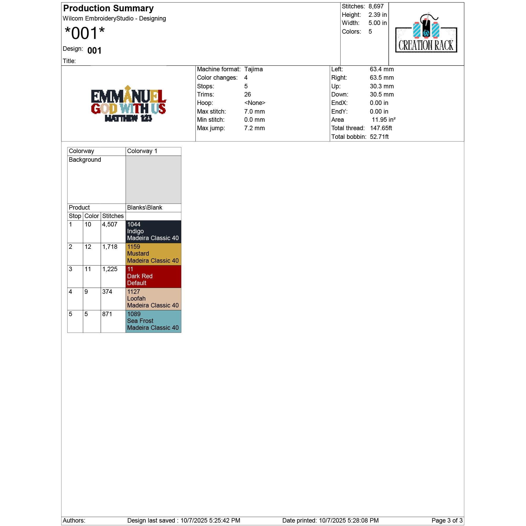 001: 8,697 stitches | 2.39 in (6.1 cm) x 5.00 in (12.7 cm) | 5 colors