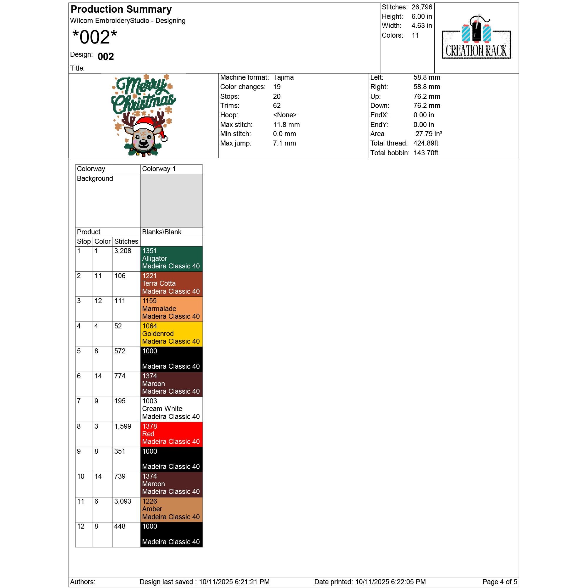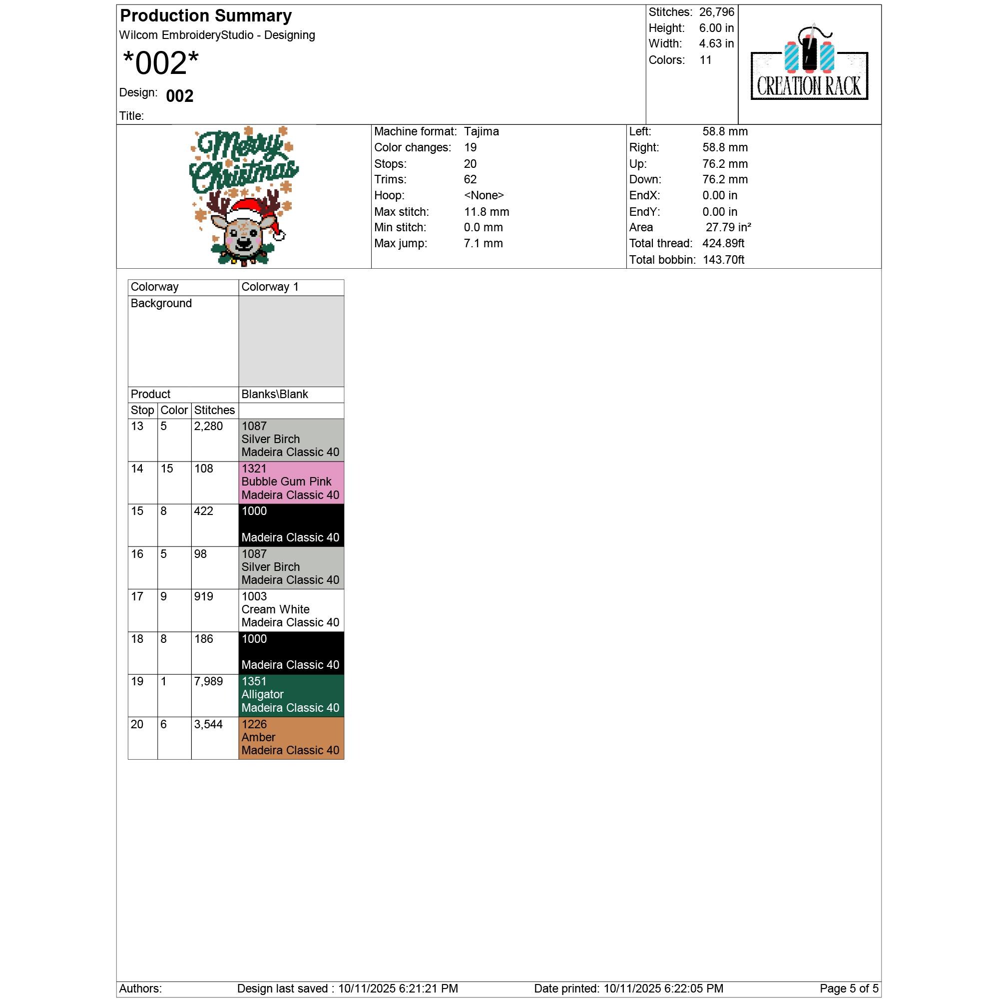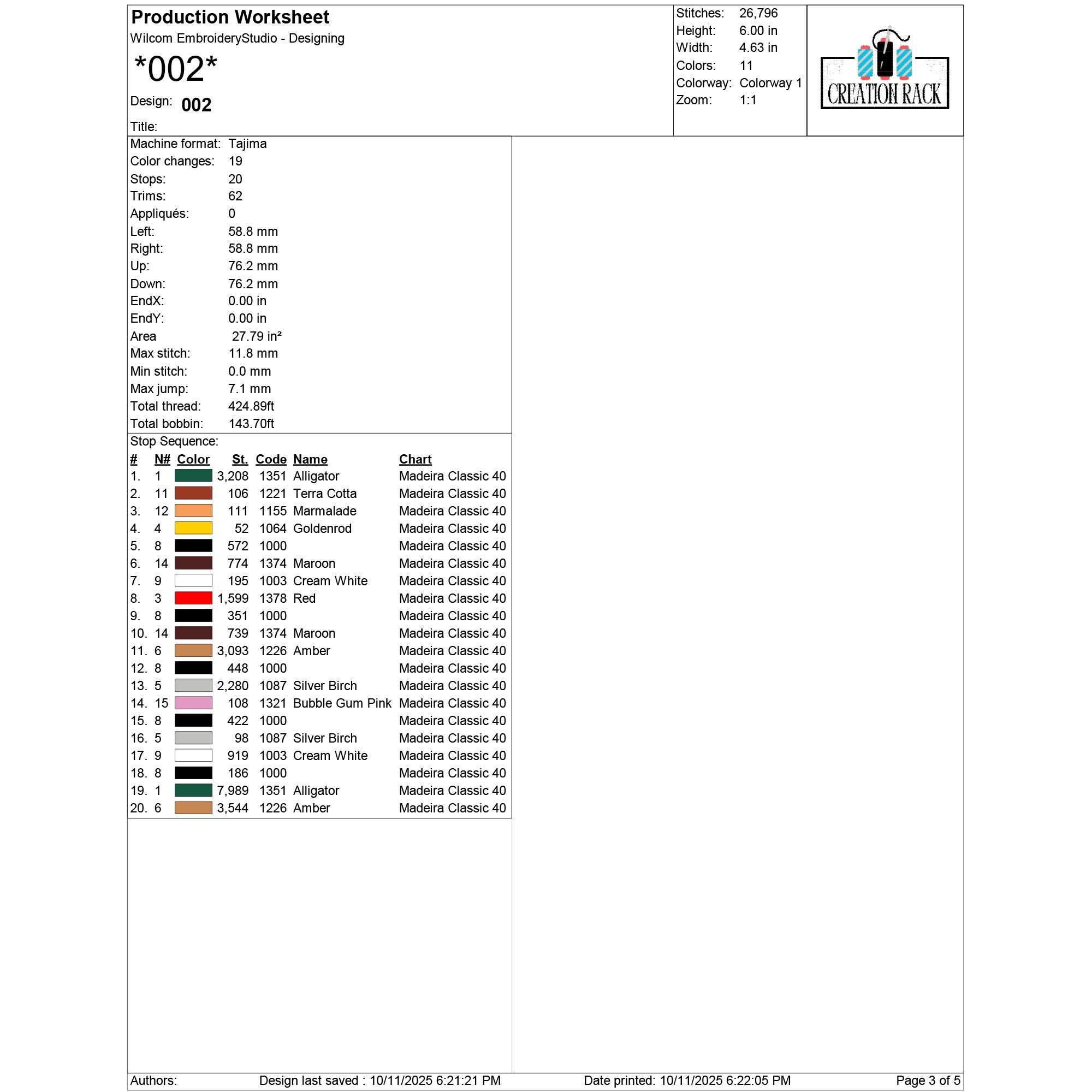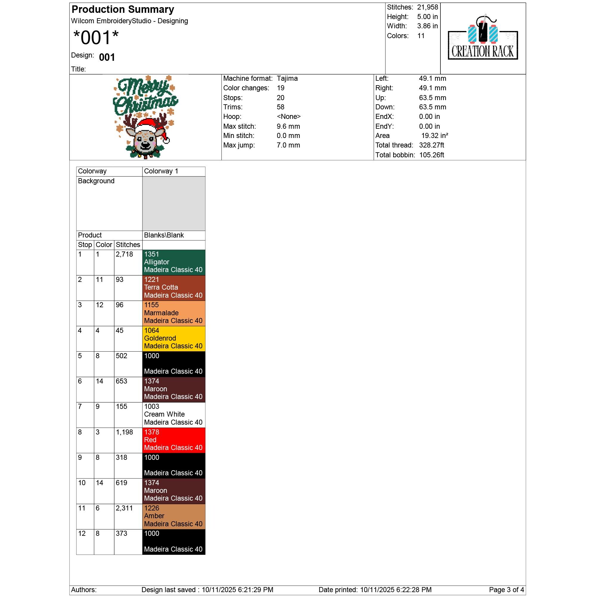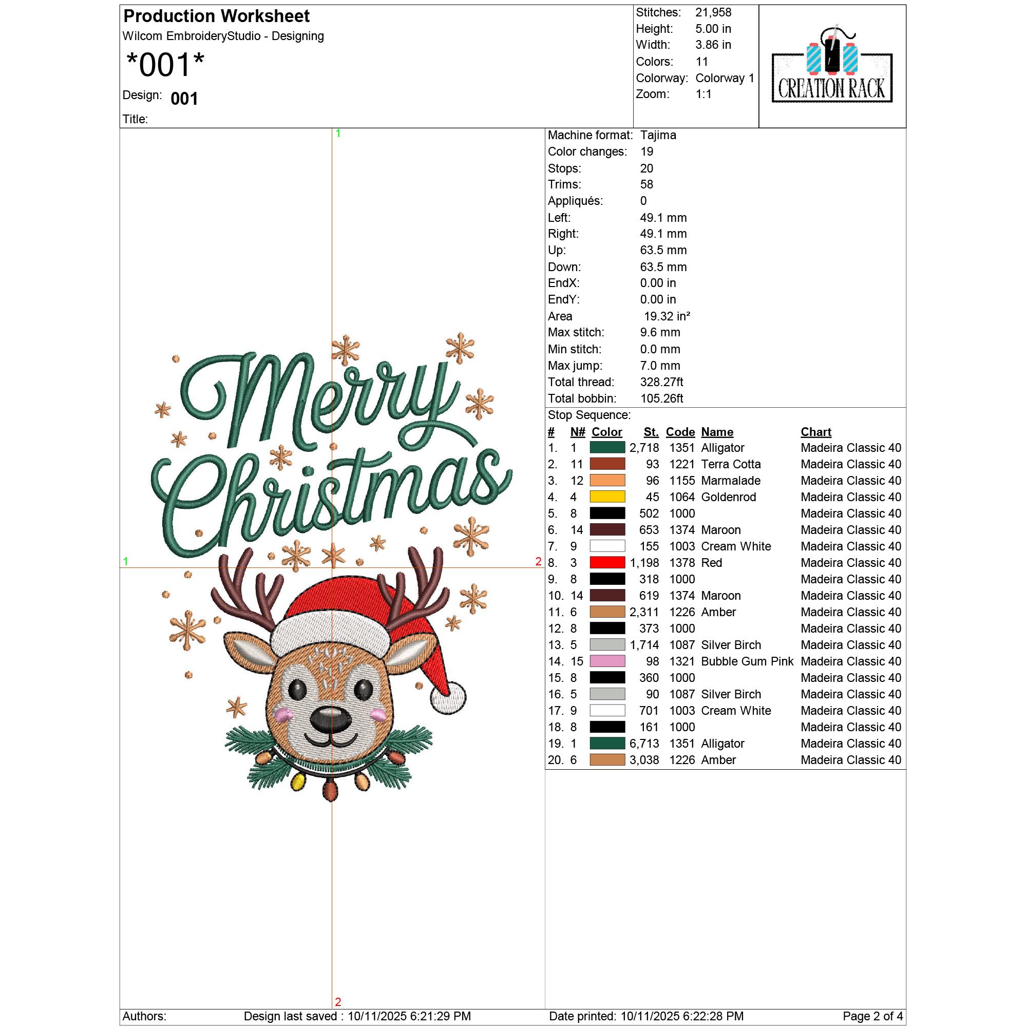 001: 21,958 stitches | 12.7 cm (5.00 in) × 9.80 cm (3.86 in) | 11 colors