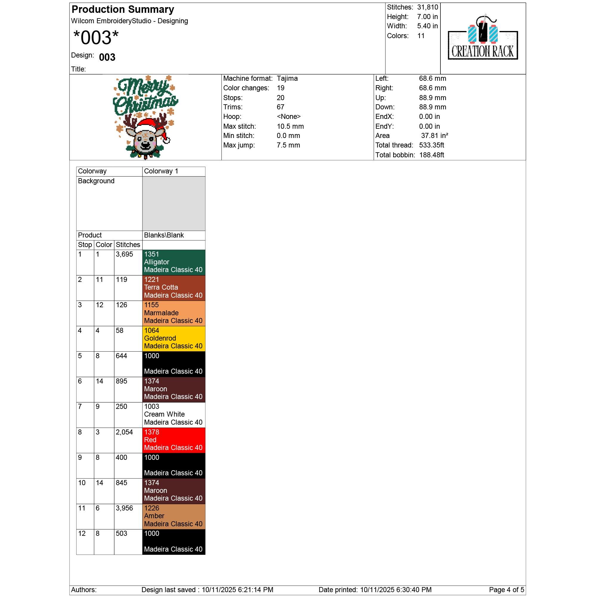 003: 31,810 stitches | 17.78 cm (7.00 in) × 13.72 cm (5.40 in) | 11 colors