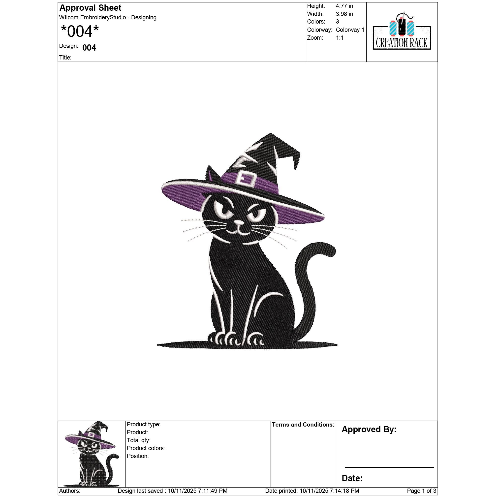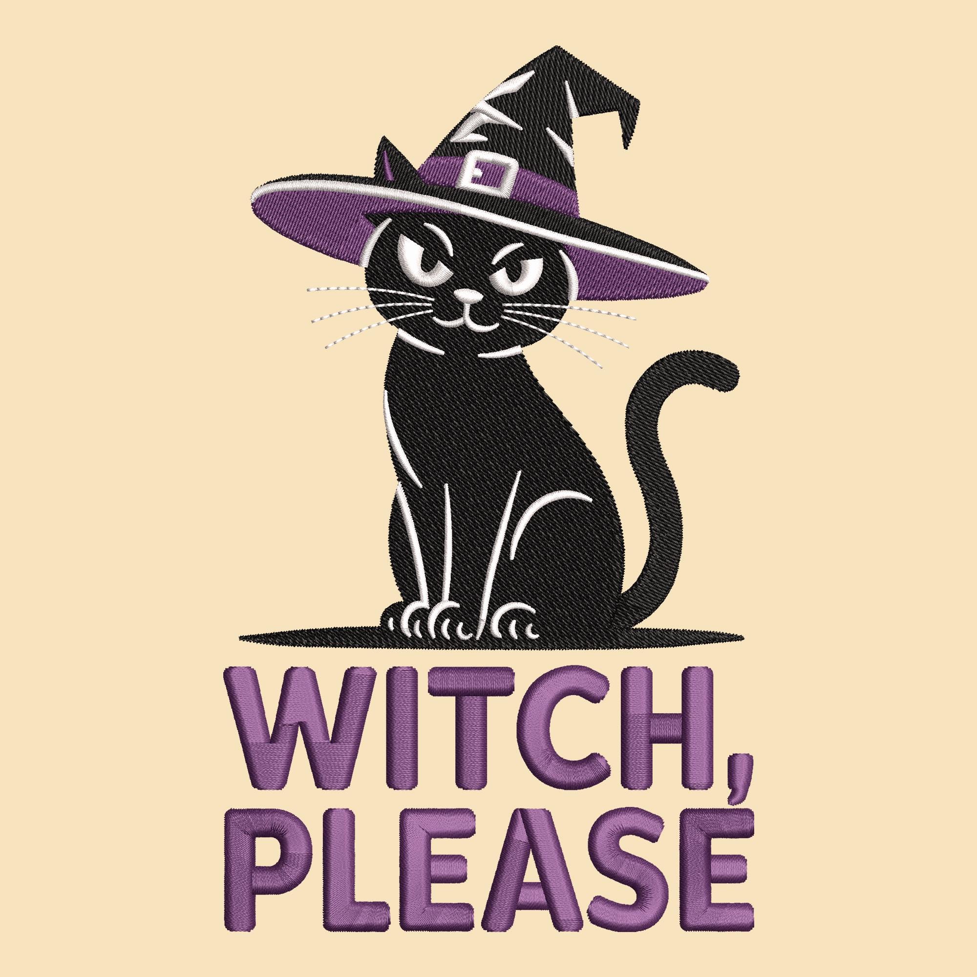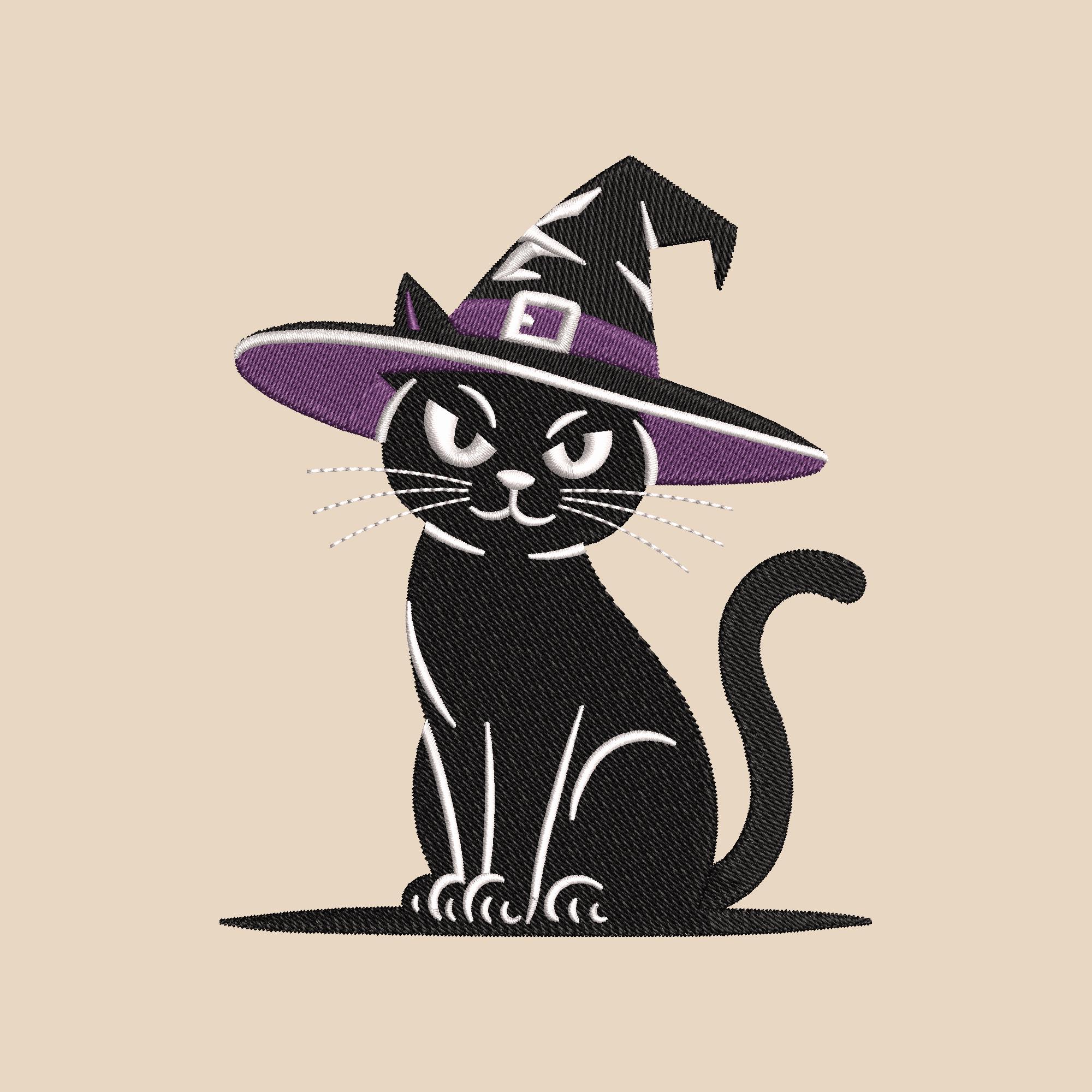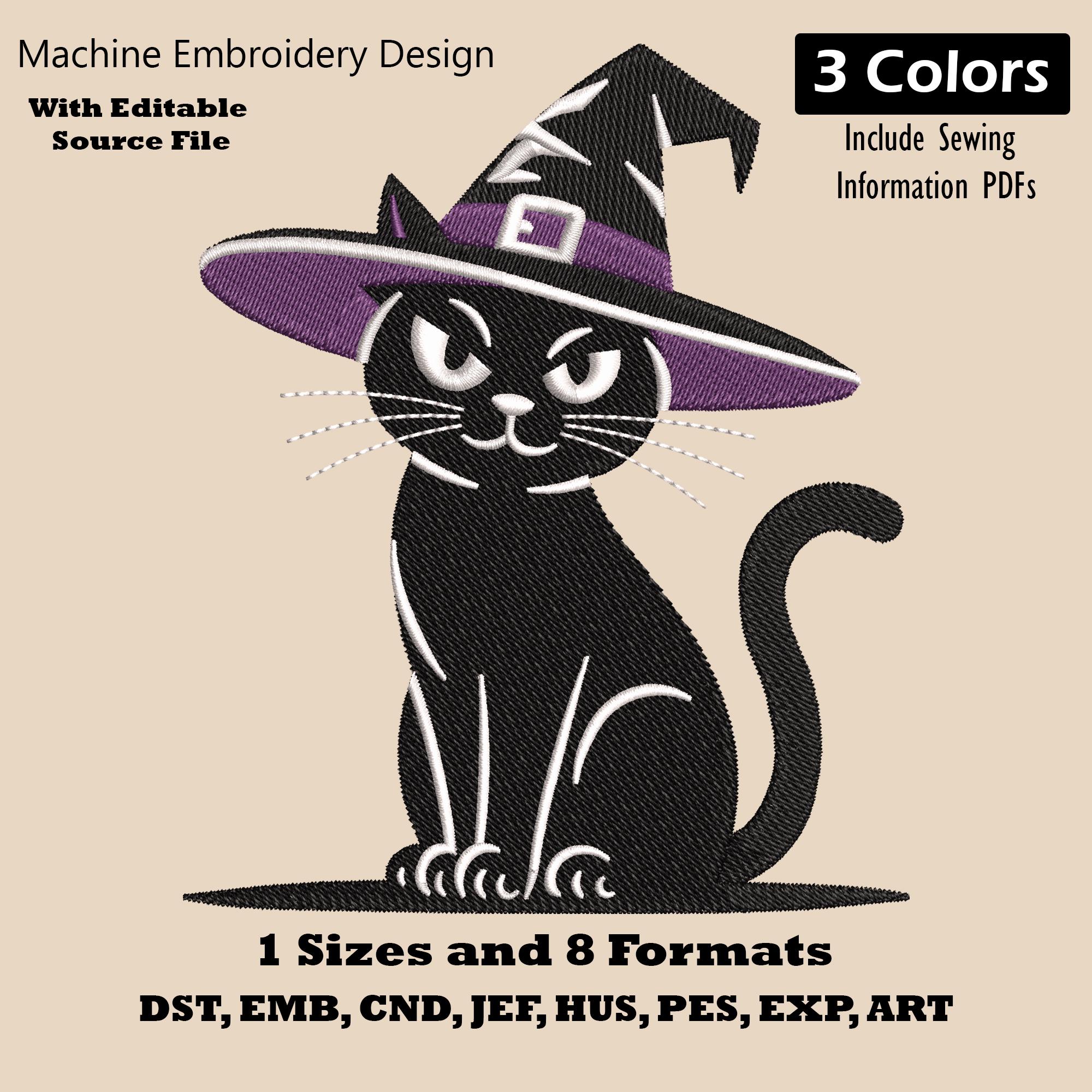 Halloween Black Cat with Witch Hat Embroidery Design: Spooky Cat Machine Embroidery File