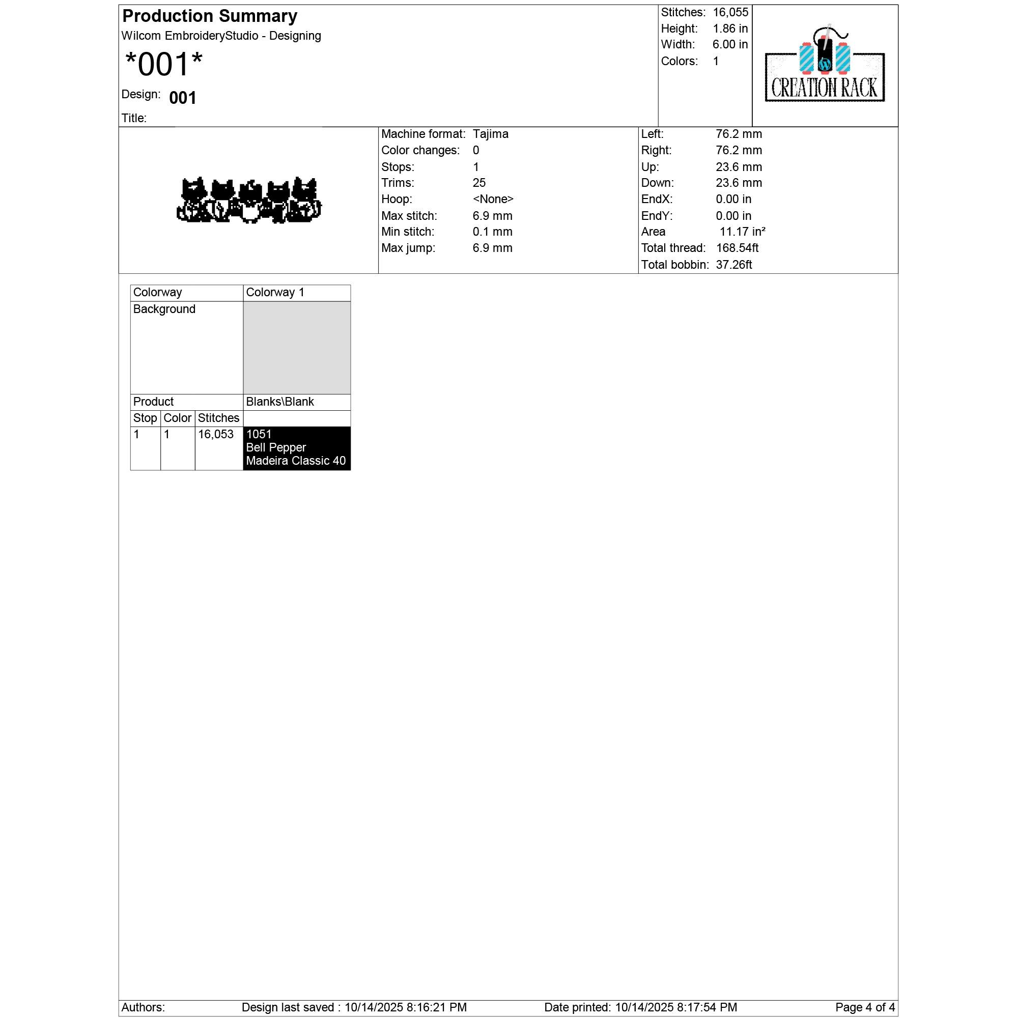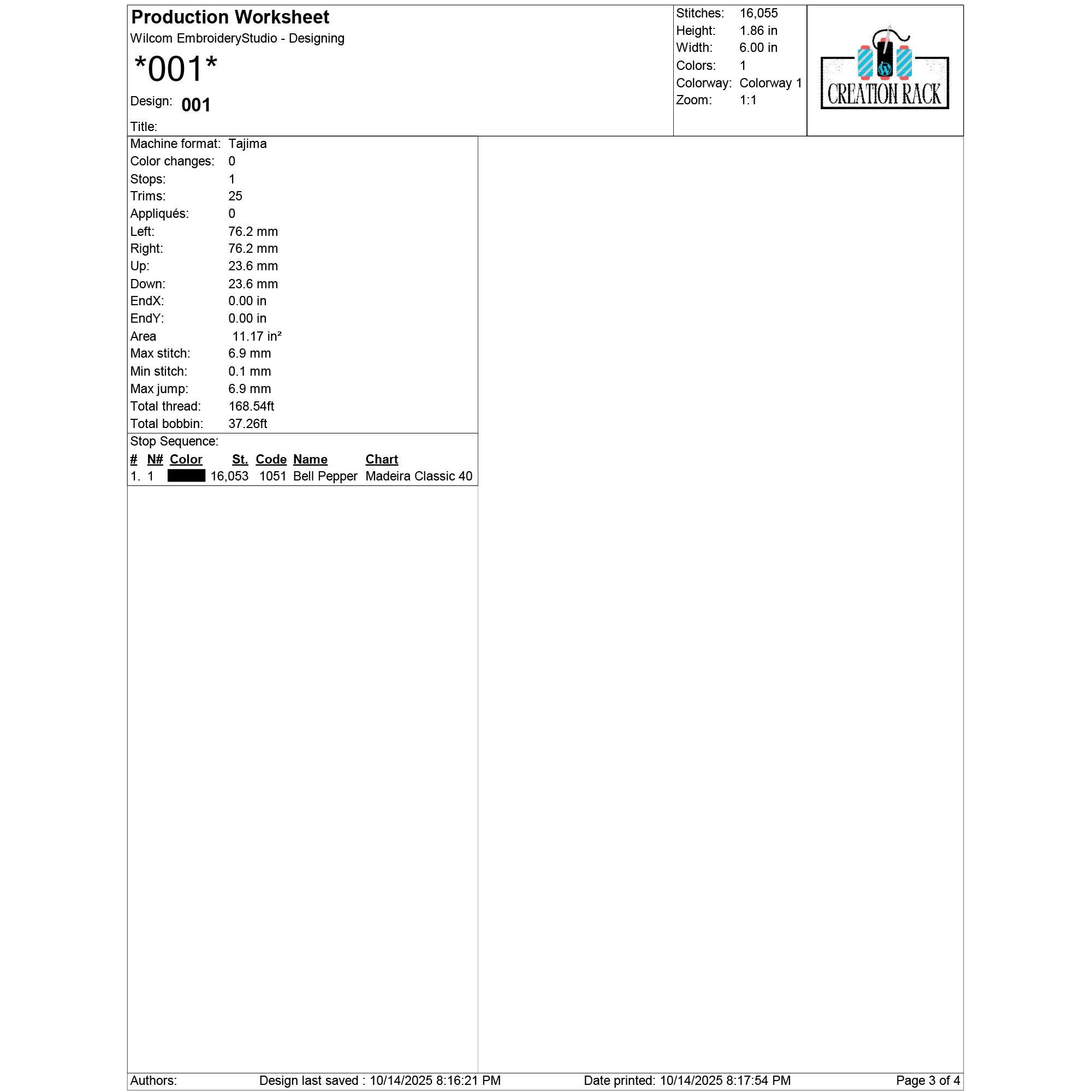 001: 16,055 stitches | Height: 1.86 in | Width: 6.00 in | 1 color