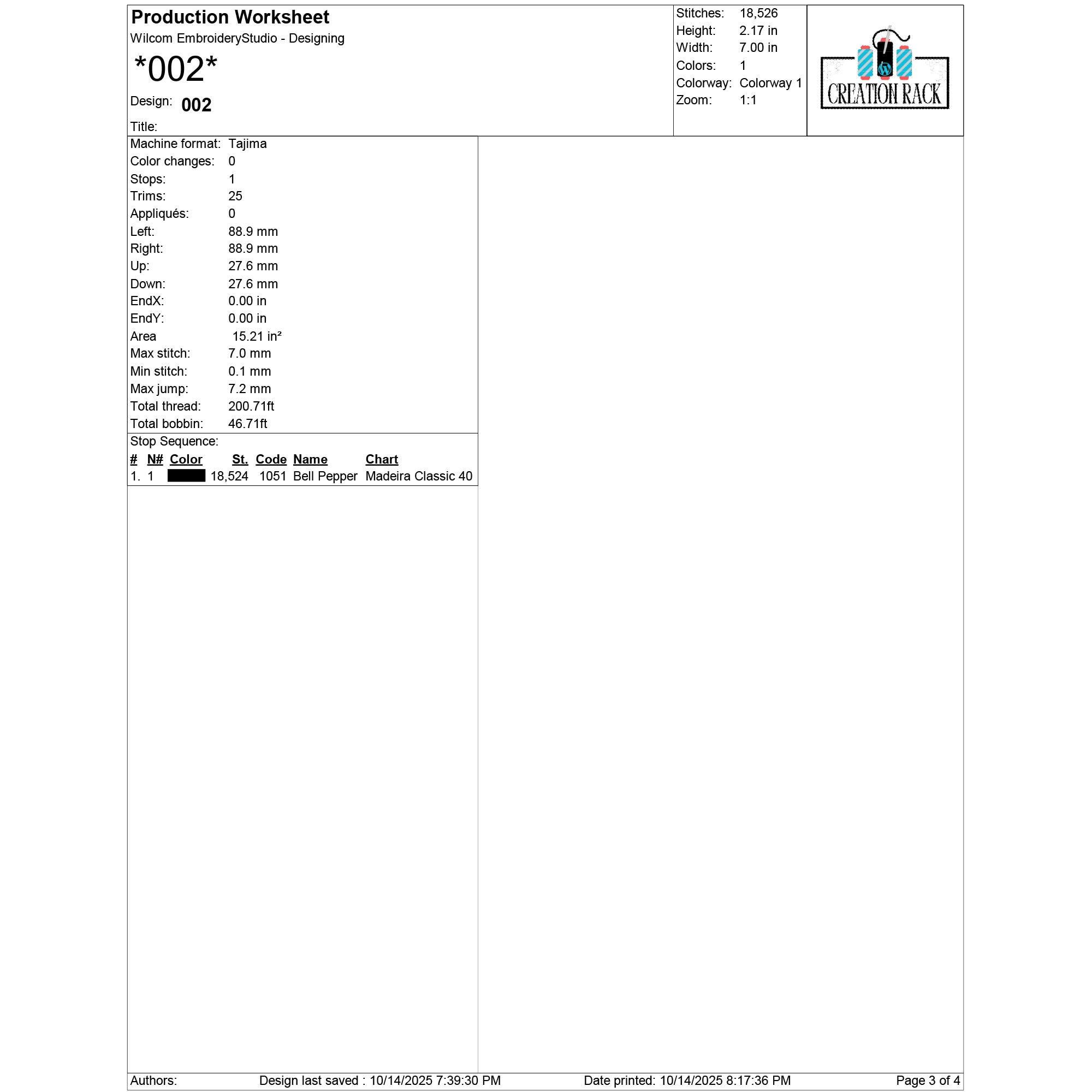 002: 18,526 stitches | Height: 2.17 in | Width: 7.00 in | 1 color