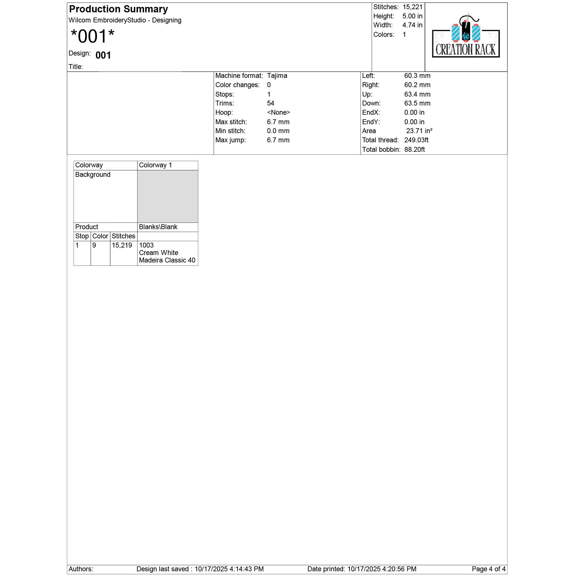 001: 15,221 stitches | 5.00" (H) x 4.74" (W) | 1 color