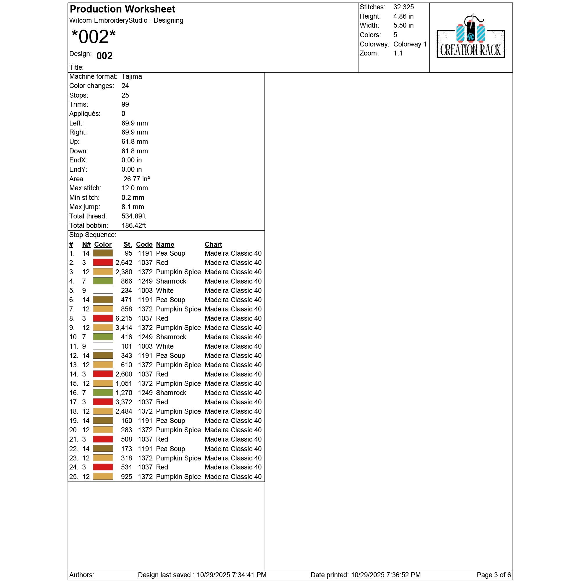 002: 32,325 stitches | 4.86" (12.3 cm) H × 5.50" (14.0 cm) W | 5 colors
