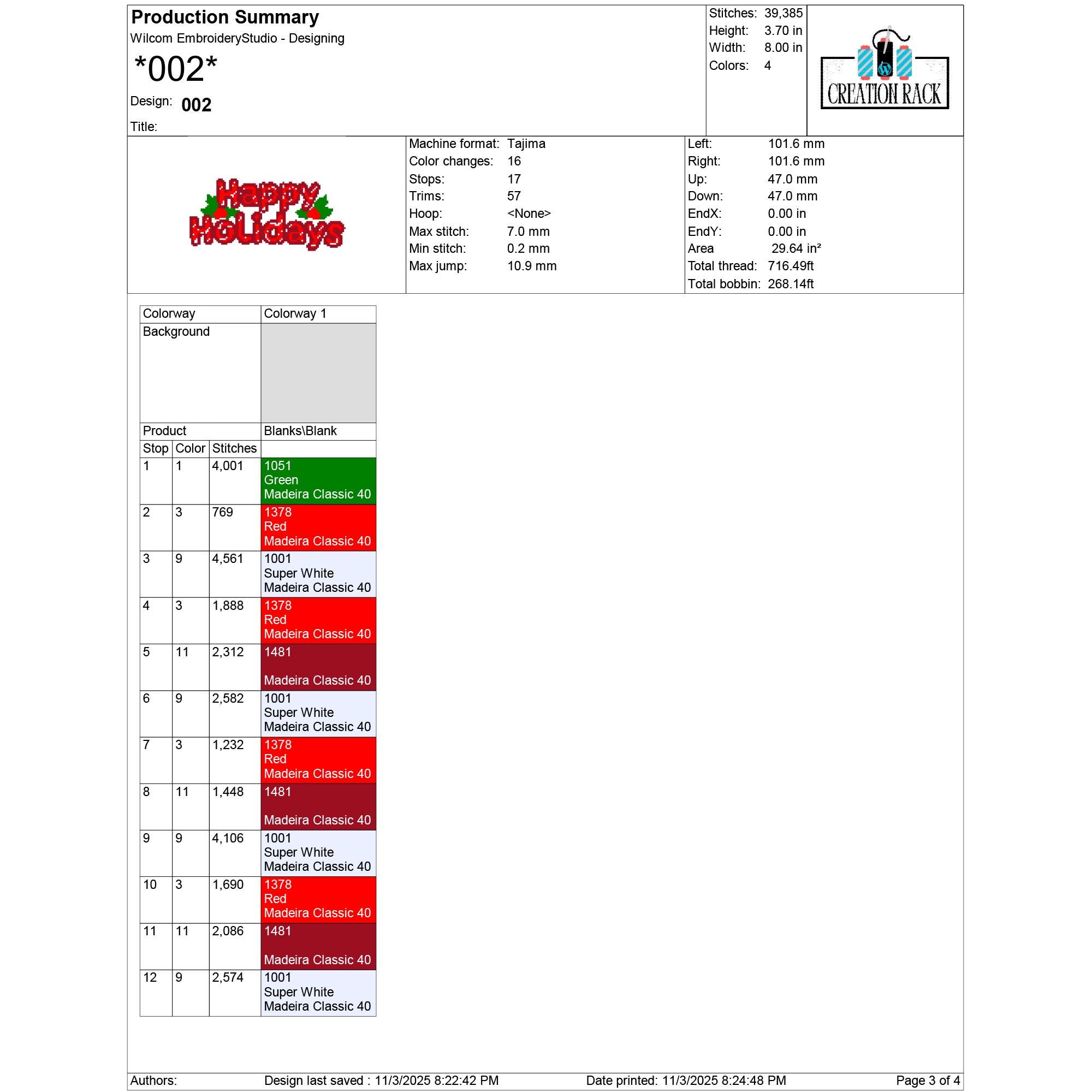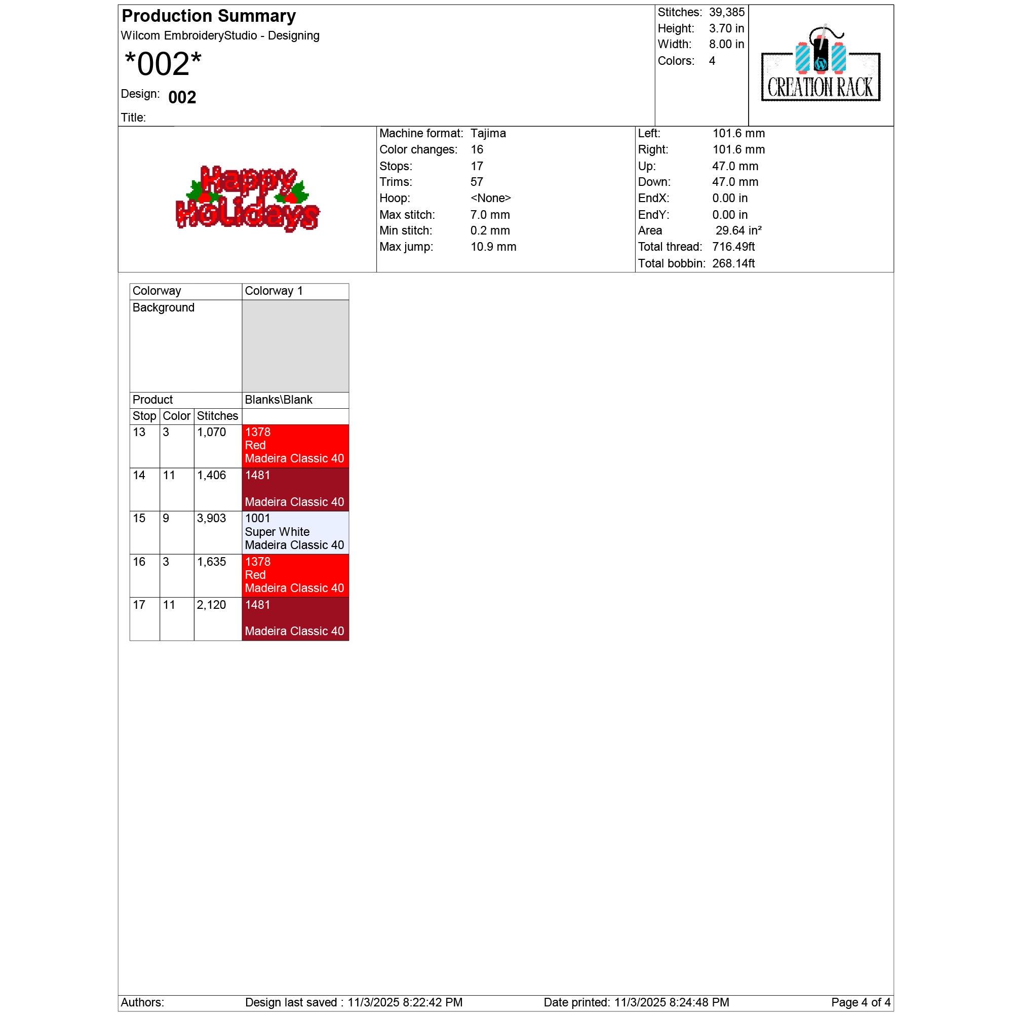 002: 39,385 stitches | 3.70 in (9.39 cm) x 8.00 in (20.32 cm) | 4 colors