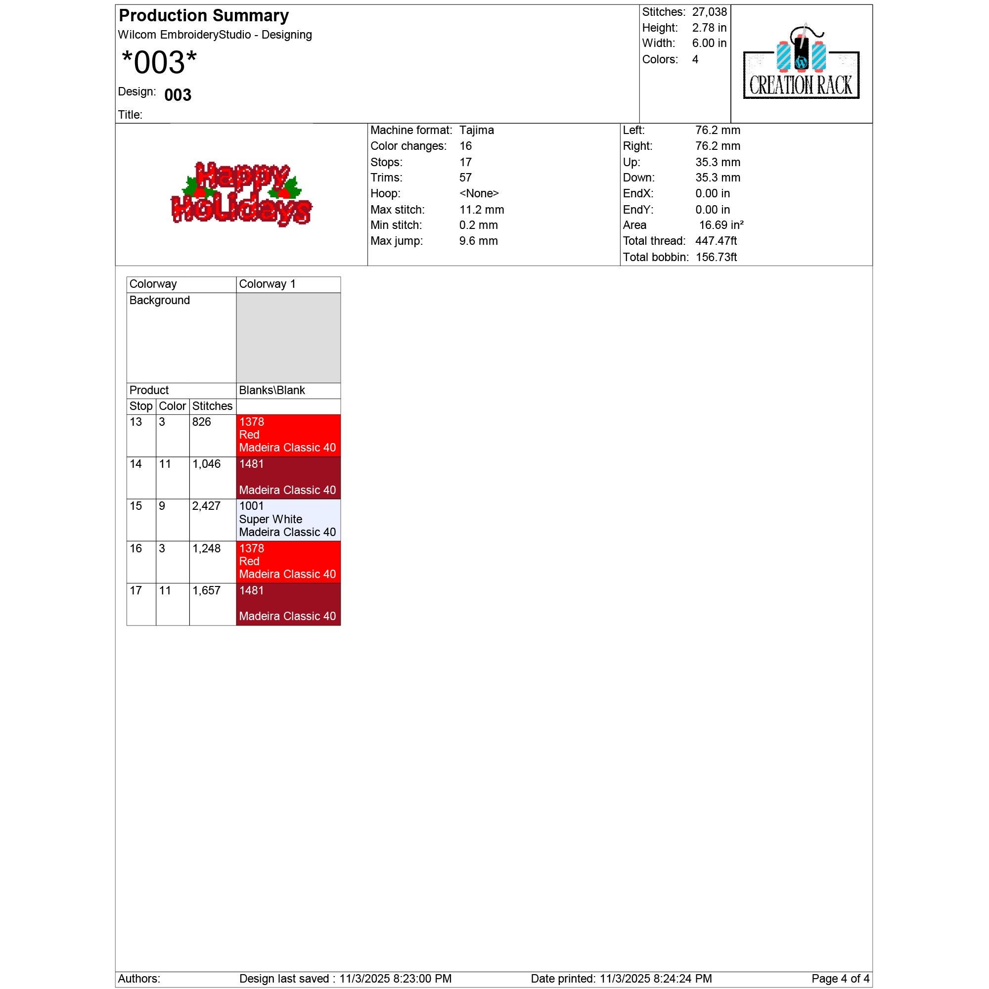 003: 27,038 stitches | 2.78 in (7.06 cm) x 6.00 in (15.24 cm) | 4 colors