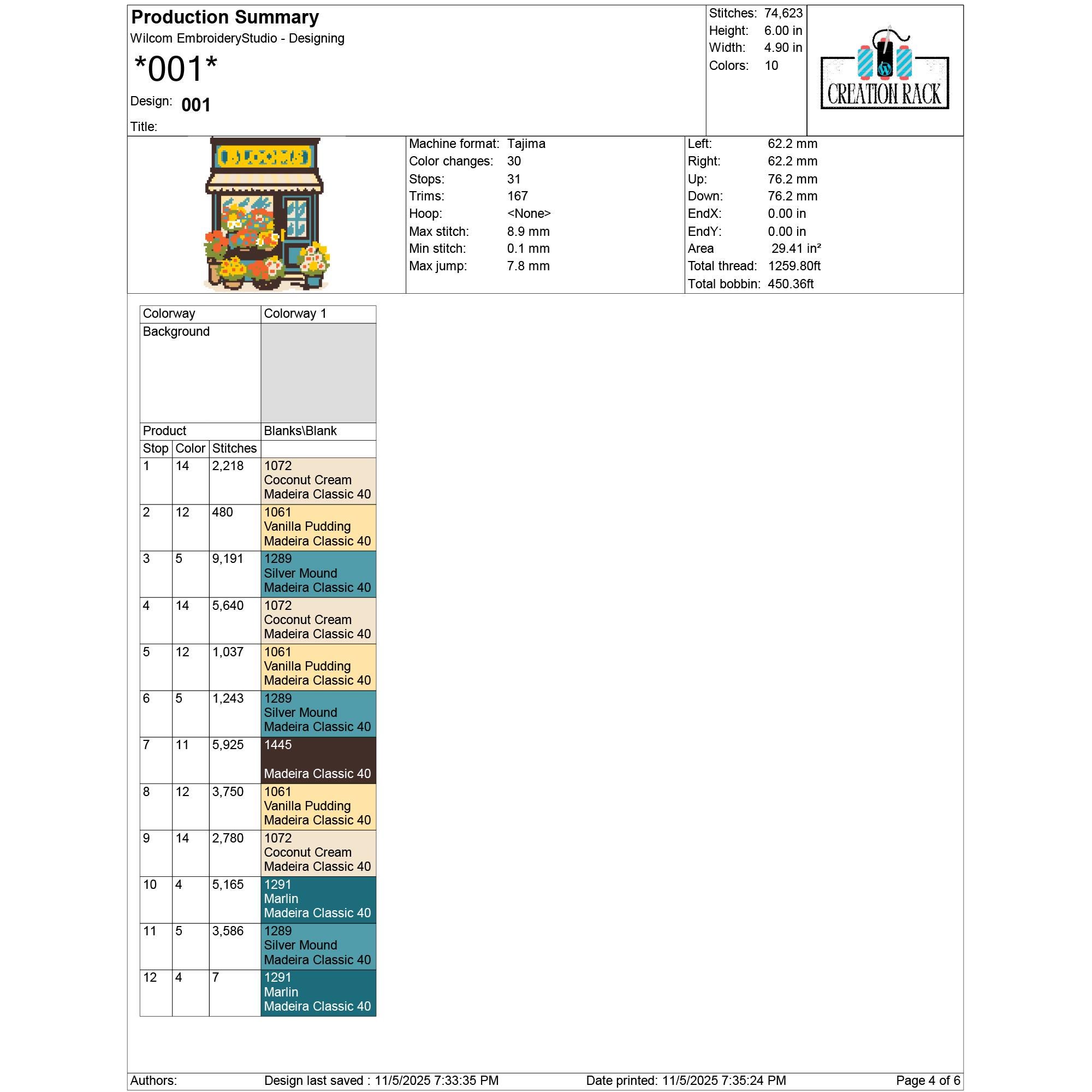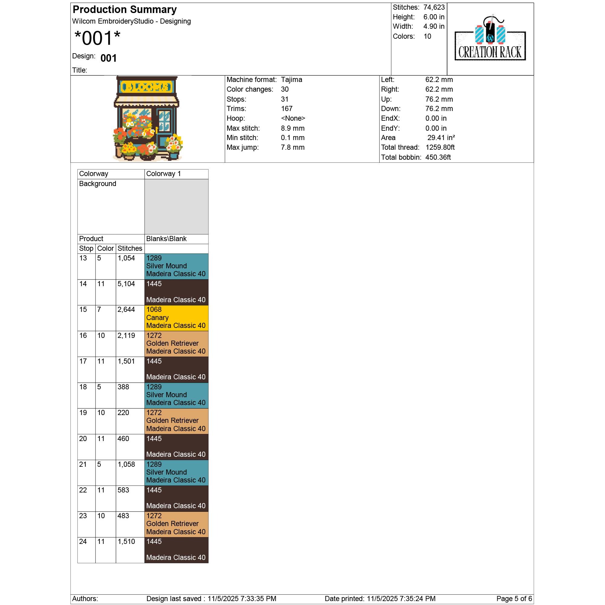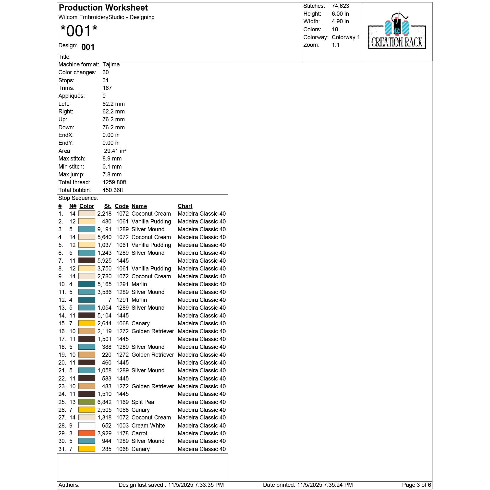 001: 74,623 stitches | 6.00 in (15.2 cm) x 4.90 in (12.4 cm) | 10 colors