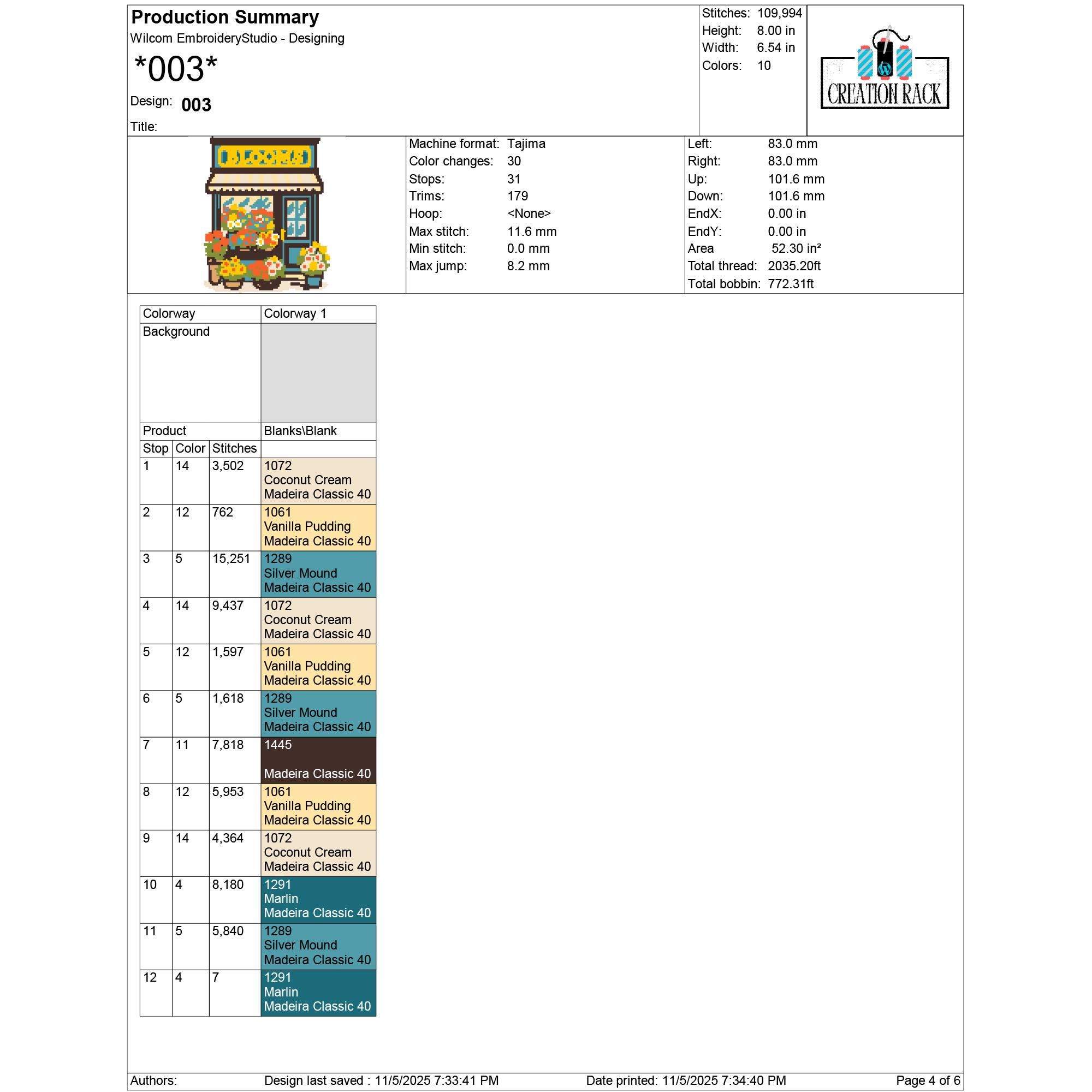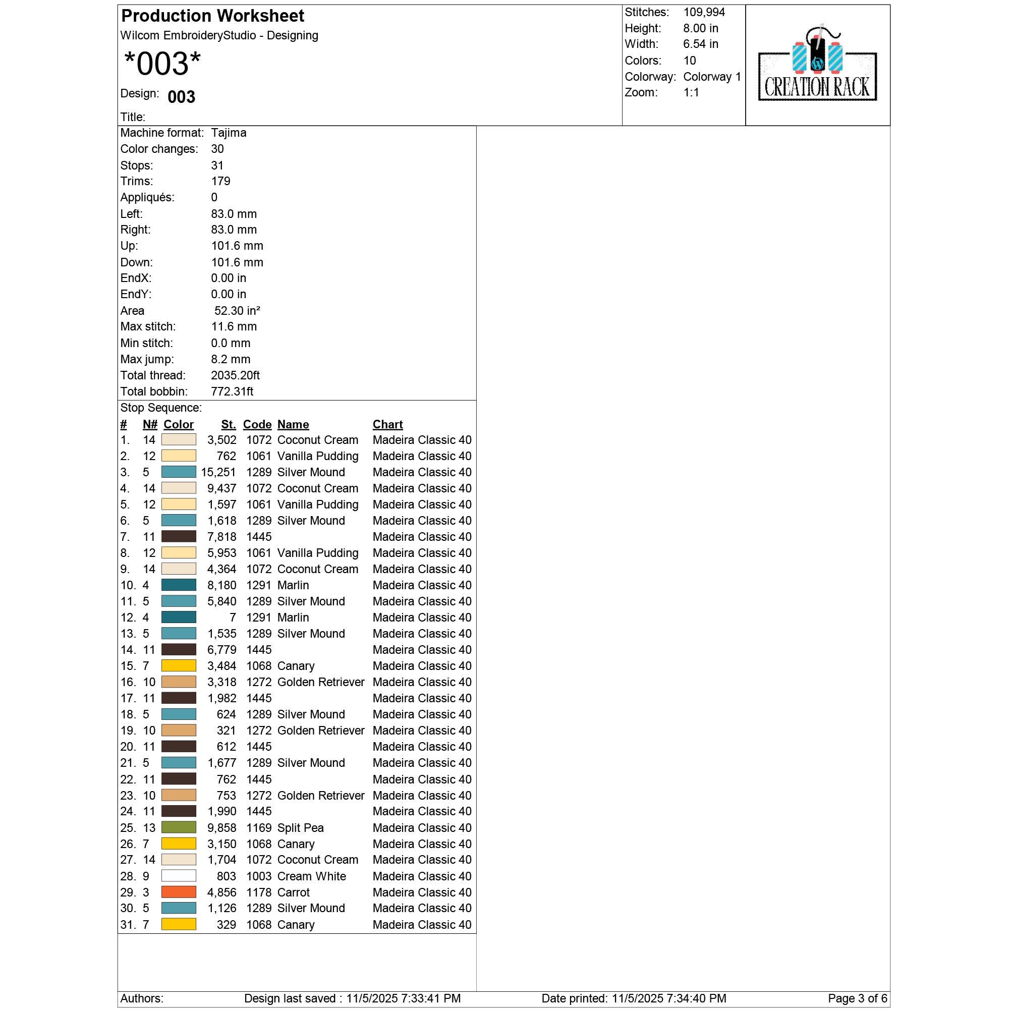 003: 109,994 stitches | 8.00 in (20.3 cm) x 6.54 in (16.6 cm) | 10 colors