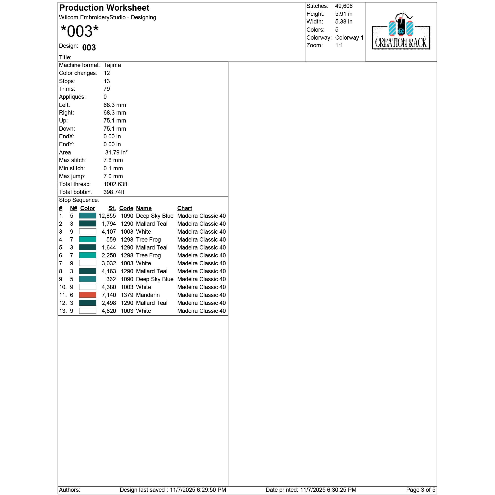 003: 49,606 stitches | 5.91 in (15.0 cm) x 5.38 in (13.7 cm) | 5 colors