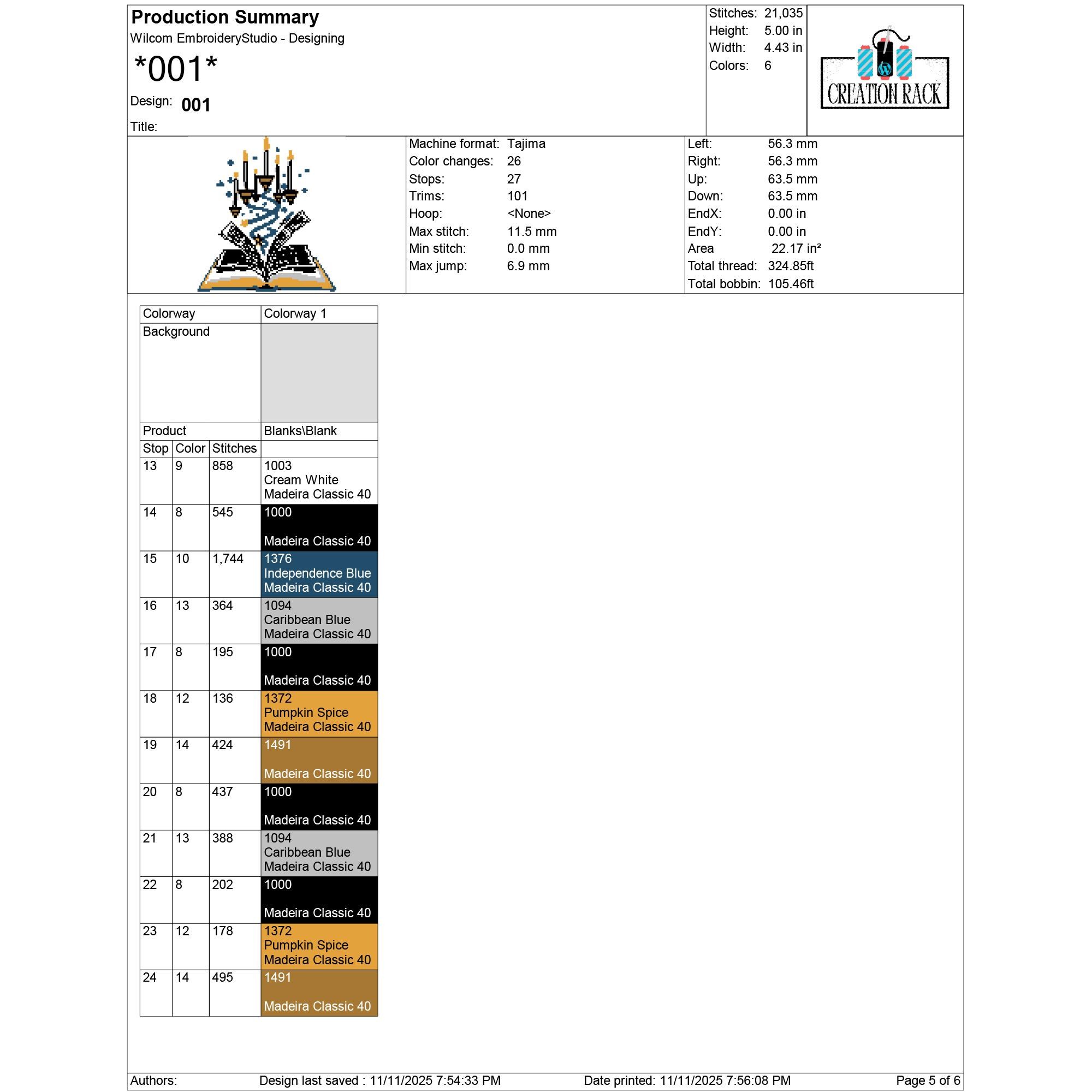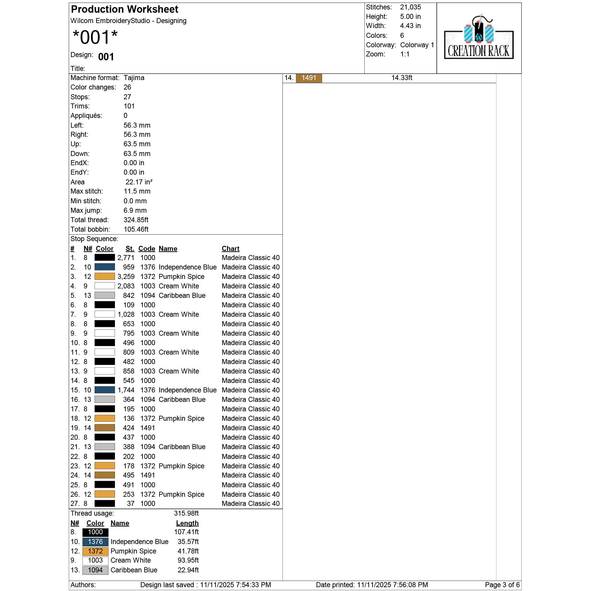 001: 21,035 stitches | 5.00 in (12.7 cm) × 4.43 in (11.3 cm) | 6 colors
