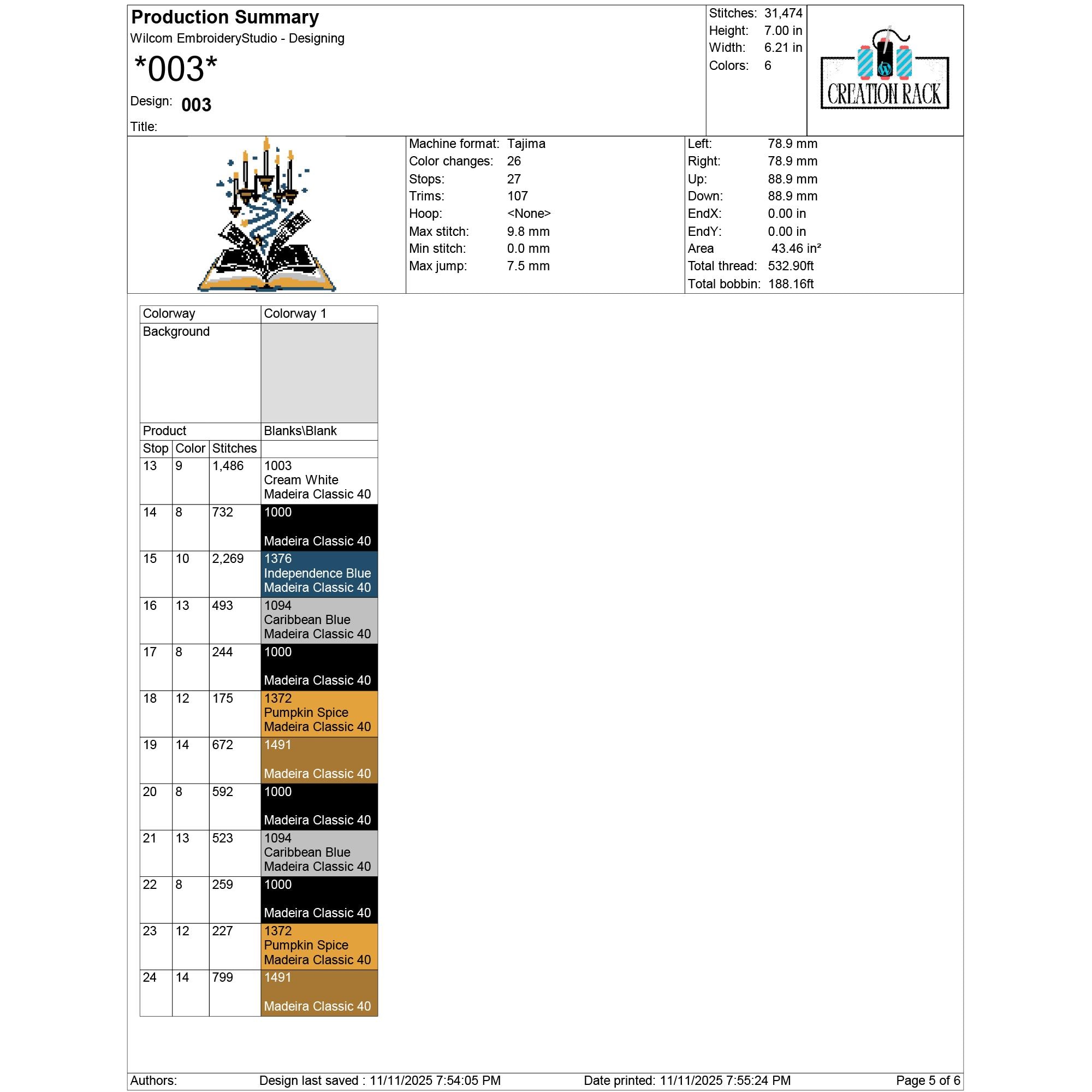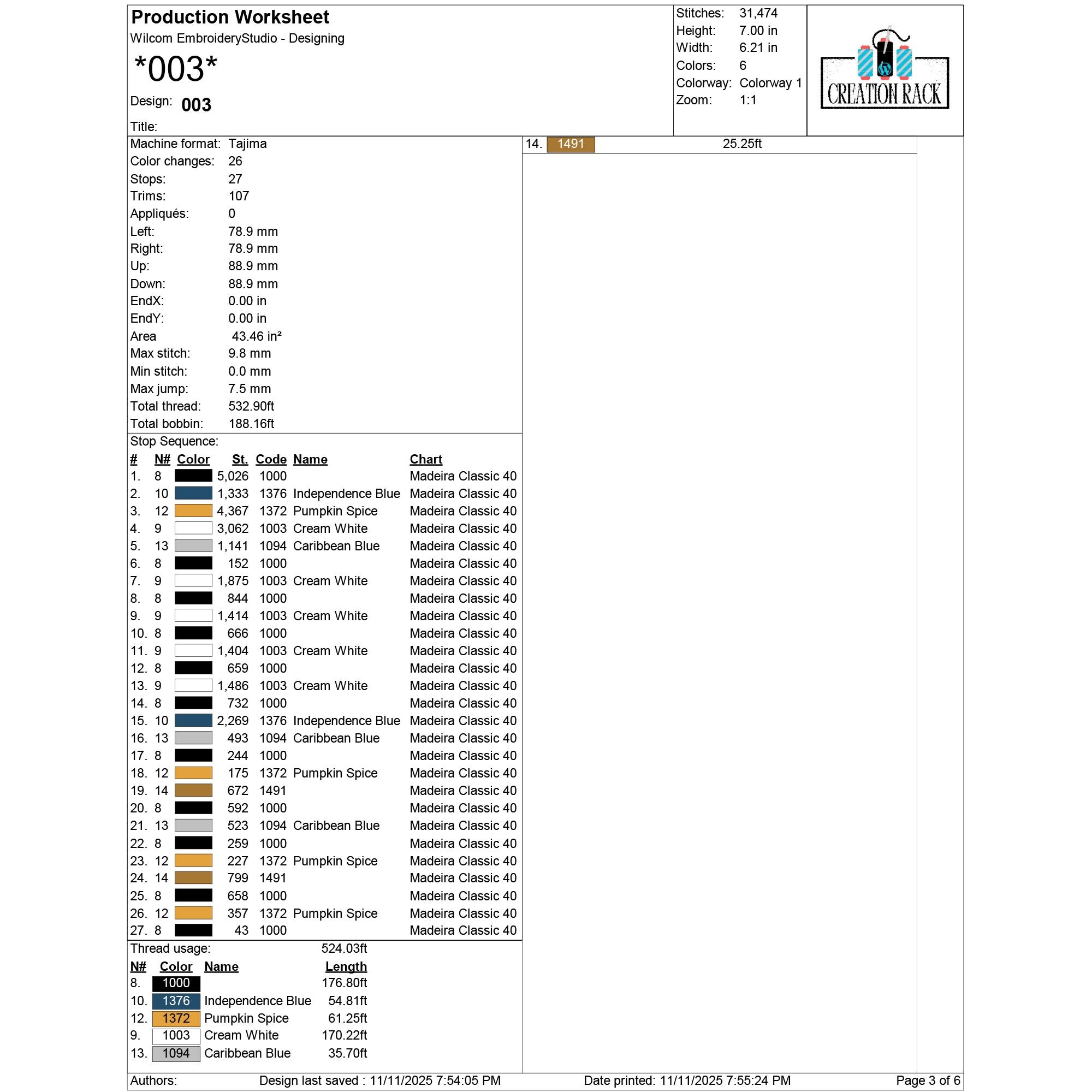 003: 31,474 stitches | 7.00 in (17.8 cm) × 6.21 in (15.8 cm) | 6 colors