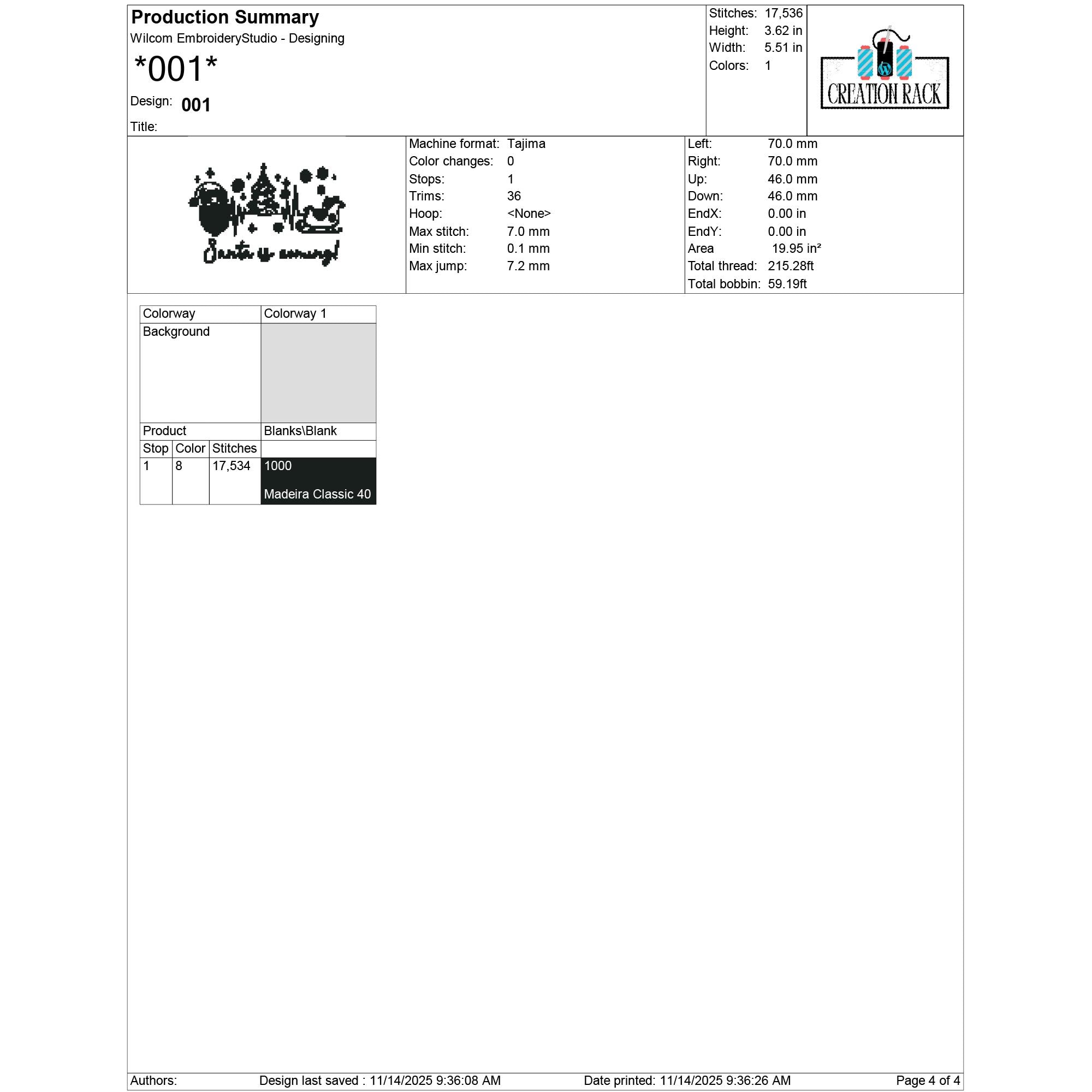 001: 17,536 stitches | 3.62 in (9.1 cm) × 5.51 in (14.0 cm) | 1 color
