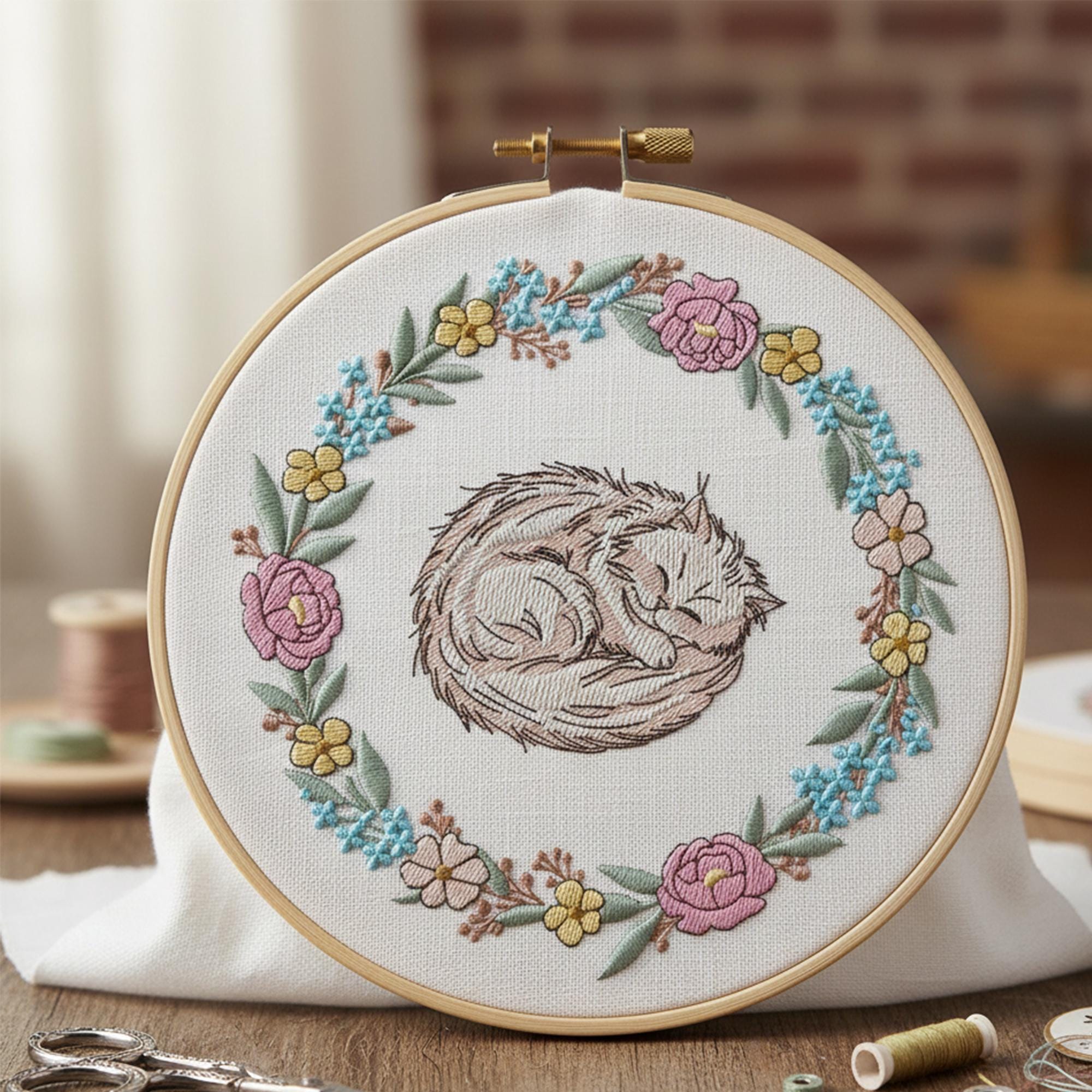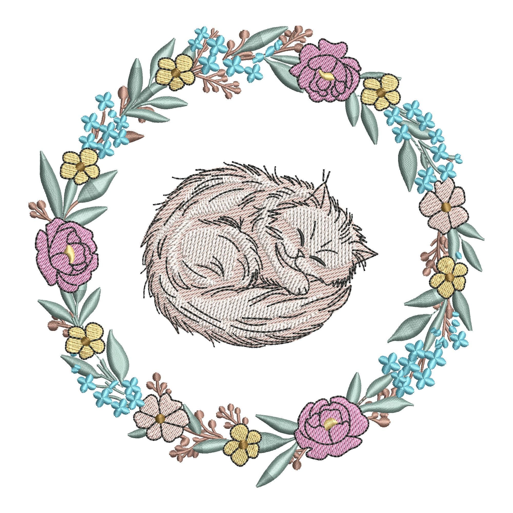 Cat in Floral Wreath Embroidery Design – Whimsical Machine Embroidery File