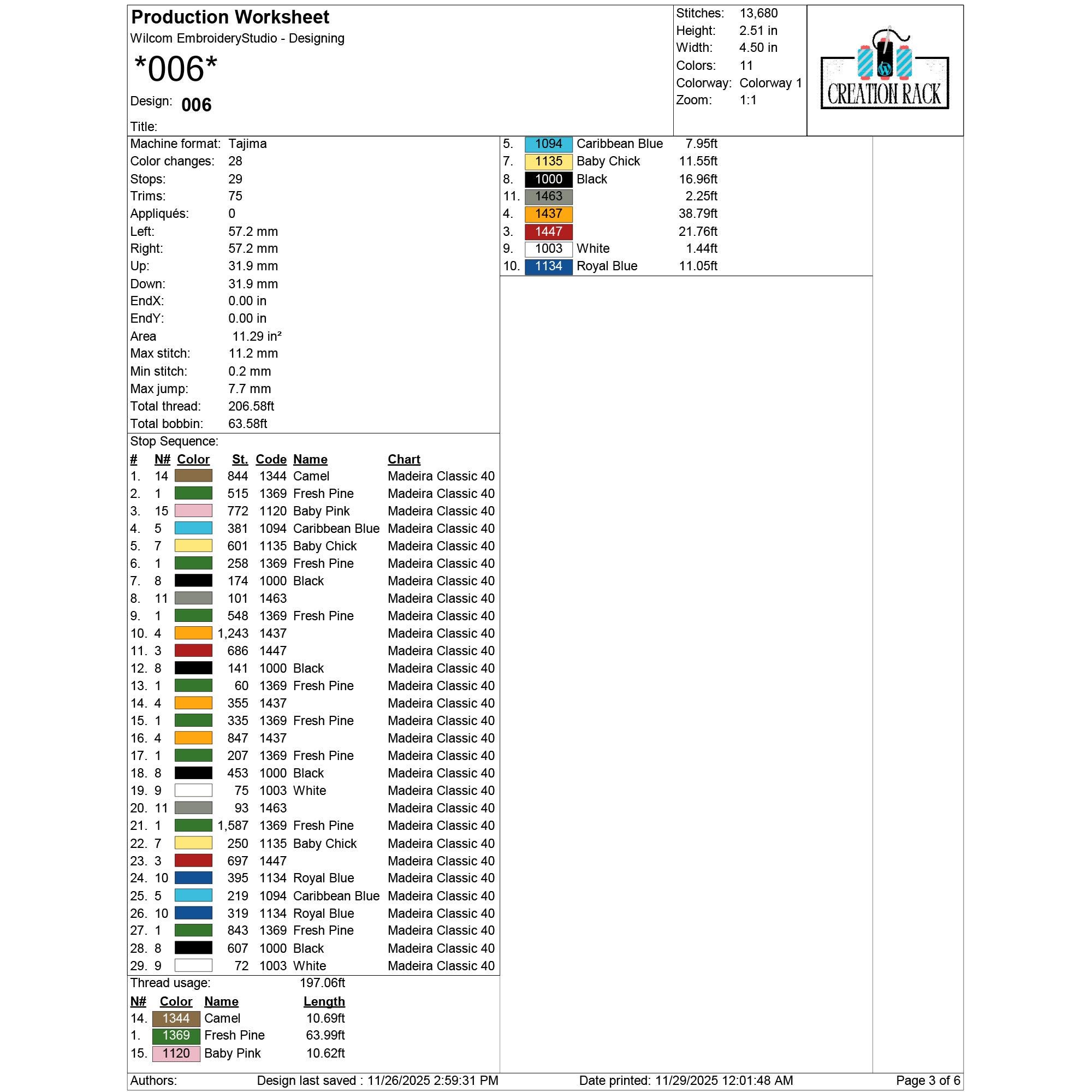 006: 13,680 stitches | 2.51 in × 4.50 in (6.38 cm × 11.43 cm / 63.8 mm × 114.3 mm) | 11 colors